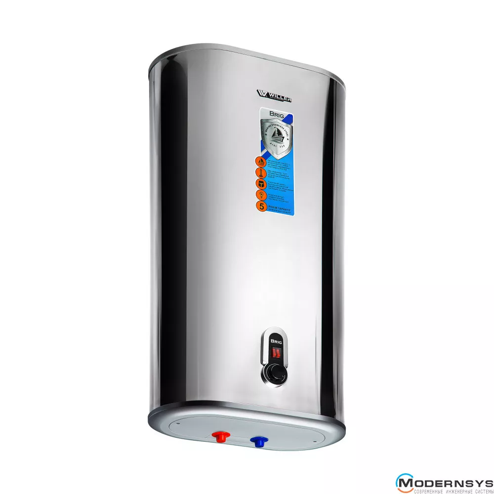 WILLER IV50DR Brig - плоский електричний водонагрівач з внутрішнім баком з нержавіючої сталі AISI316 (відрізняється вищою антикорозійною стійкістю в порівнянні з поширеною AISI304). Мінімальна глибина виробу (295мм з урахуванням монтажних планок) дозволить встановити бойлер навіть у стиснених простором умовах. У бойлер WILLER IV50DR Brig встановлено два незалежних сухих нагрівальних елементи потужністю 1000 Вт кожен. Нагрівальні елементи розташовані у спеціальних захисних кожухах (фланцях) і безпосередньо не контактують з водою, що значно збільшує їхню довговічність та економічність.