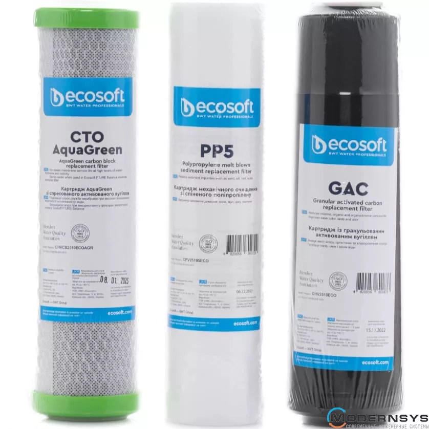 Комплект нижних картриджей Ecosoft AquaGreen Set необходимо менять раз в 3-6 месяцев (ресурс зависит от качества воды). Несвоевременная замена негативно отразится на сроке службы мембраны.