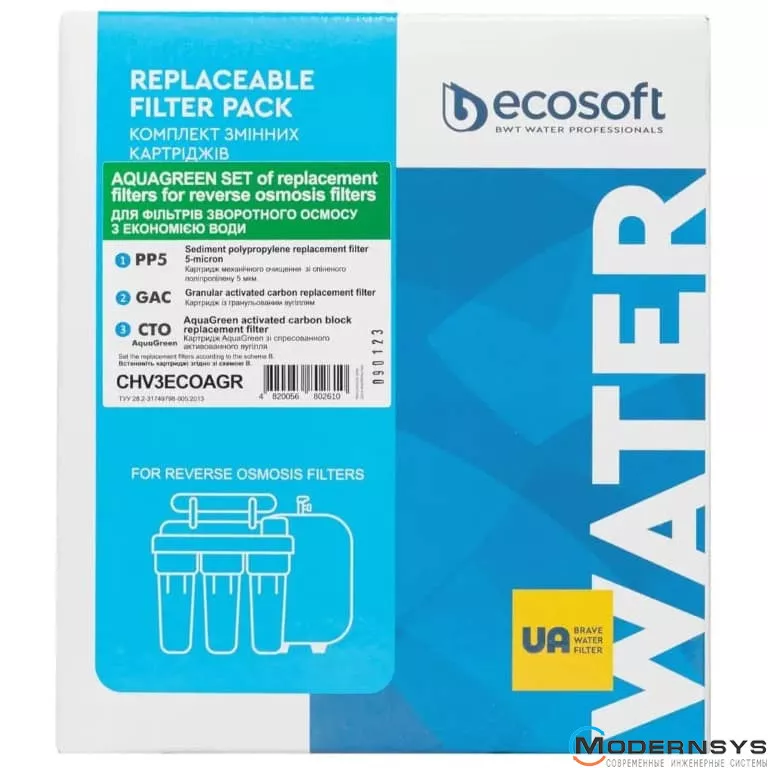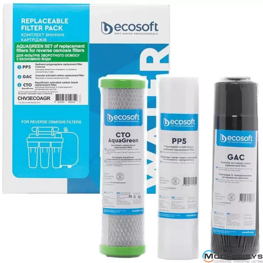 Улучшенный комплект картриджей Ecosoft 1-2-3 (CHV3ECOAGR) для фильтров обратного осмоса с функцией экономии воды - комплект состоит из трех картриджа Ecosoft, необходимые для подготовки воды перед мембранным элементом в домашнем фильтре с технологией обратного осмоса. В комплект входят два угольных картриджа, поэтому он подходит для воды с высоким содержанием хлора.