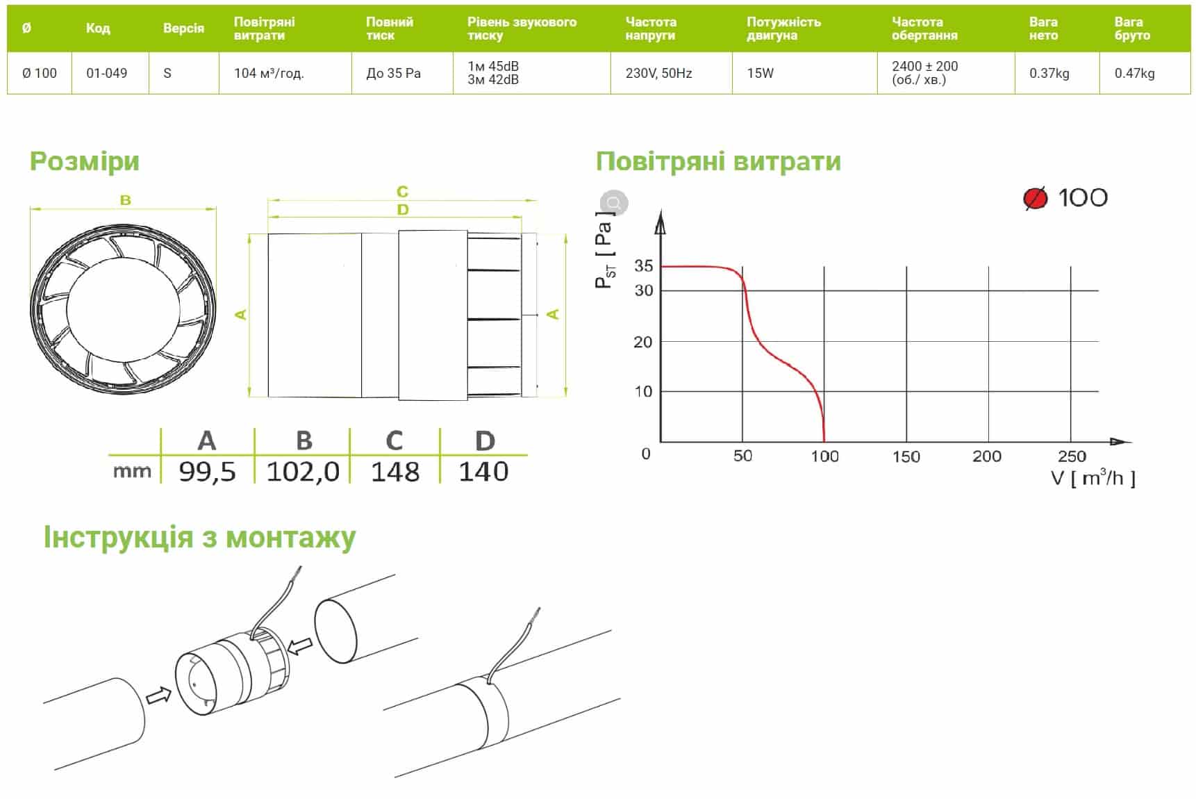 Технические характеристики: Вентилятор AirRoxy (АирРокси) канальный Стандарт aRc2 O 100 S