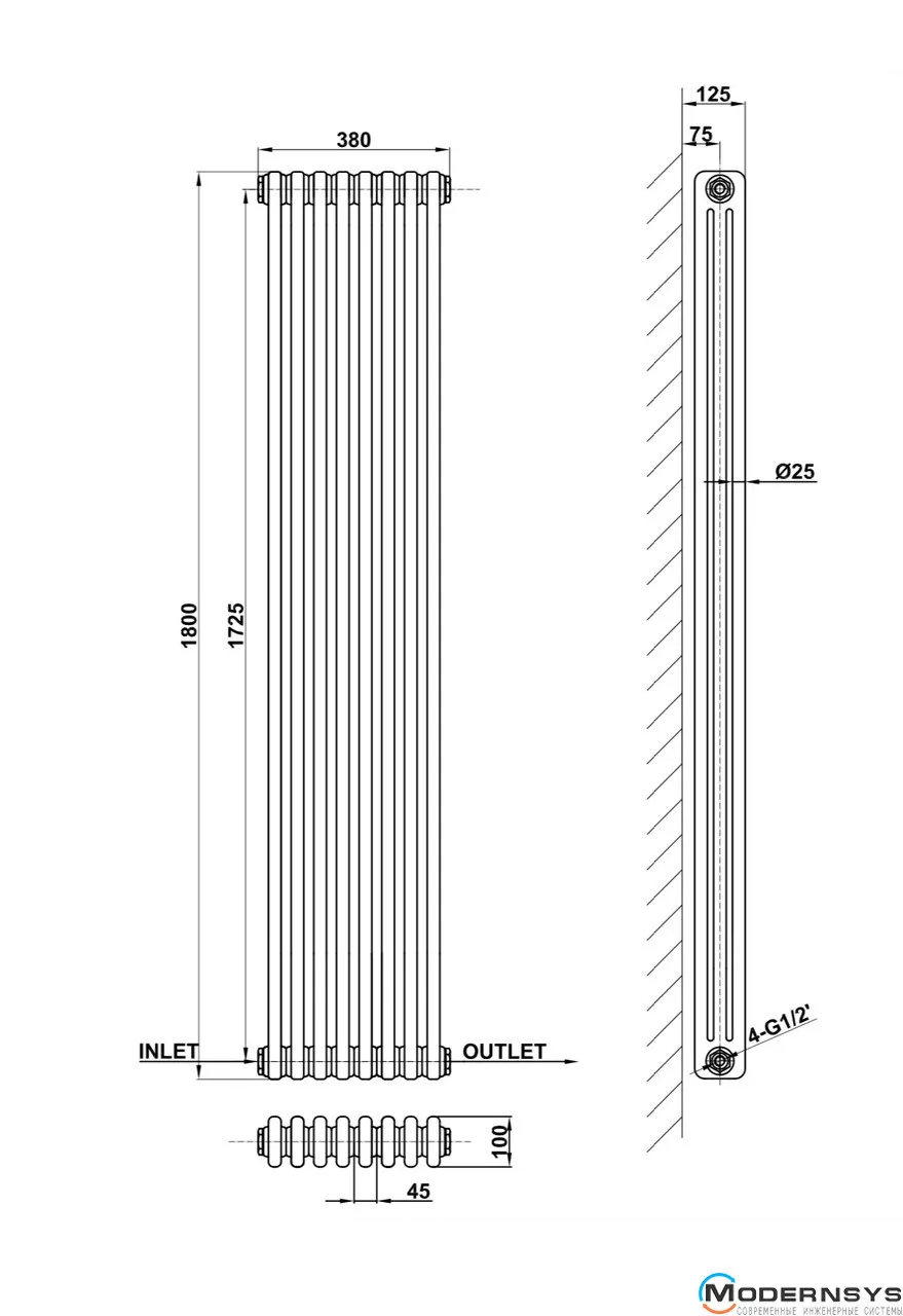 Технические характеристики: Вертикальный дизайнерский радиатор ARTTIDESIGN (Арттидизайн) Bari III 8/1800/380 черный матовый
