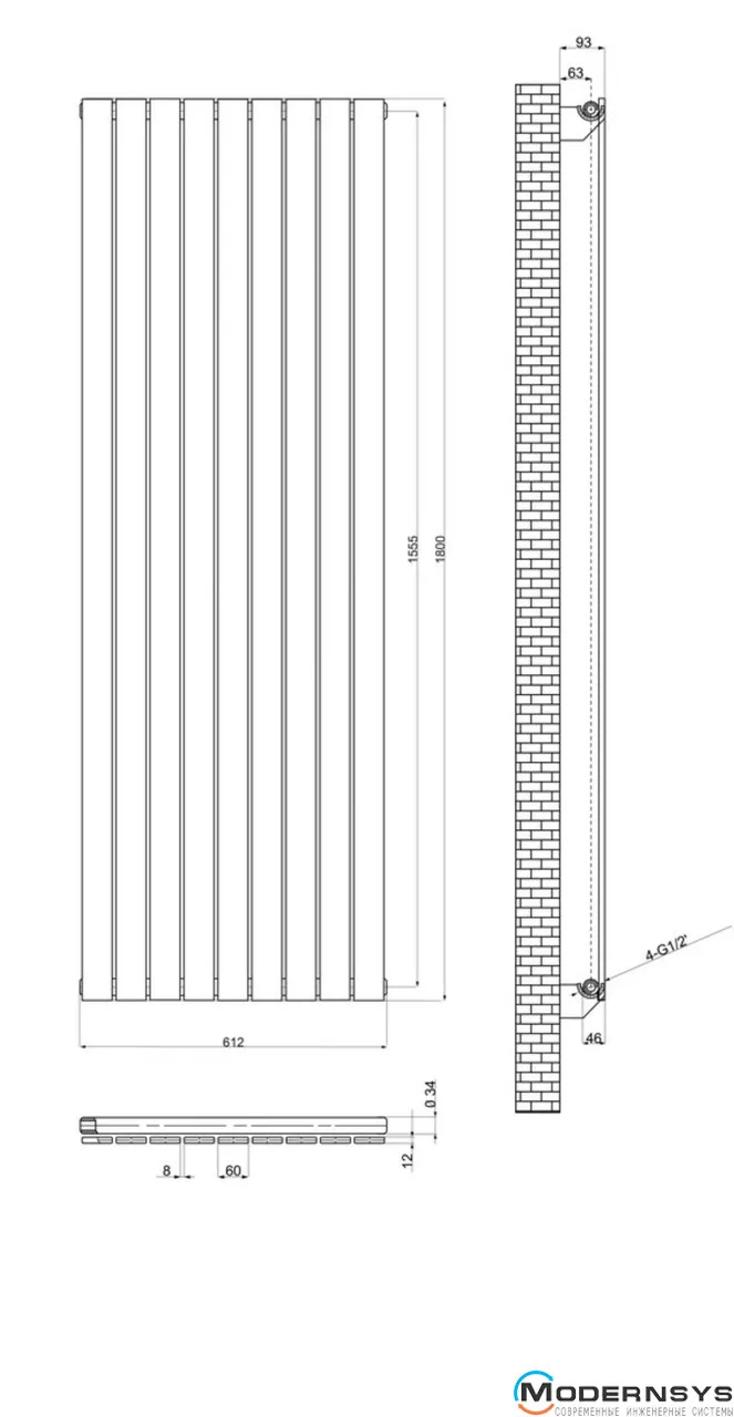 Технические характеристики: Вертикальный дизайнерский радиатор ARTTIDESIGN (Арттидизайн) Livorno 9/1800/612/50 черный матовый