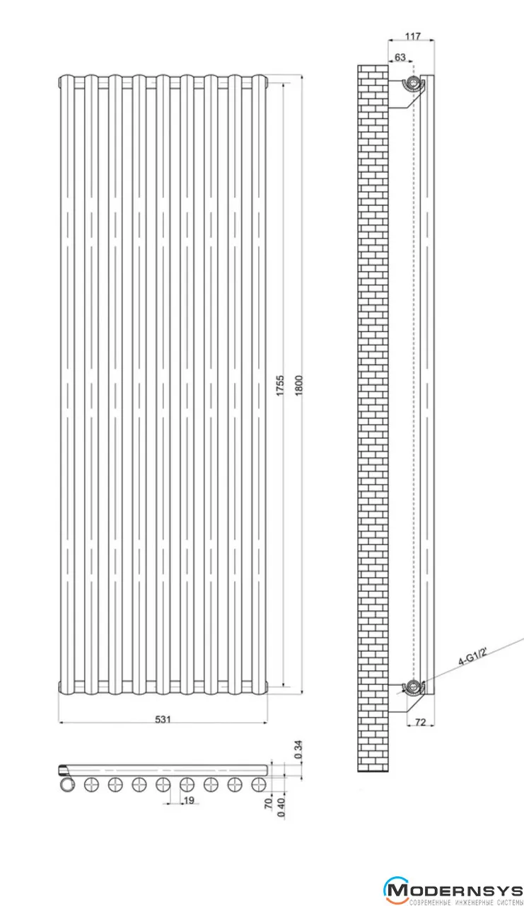 Технические характеристики: Вертикальный дизайнерский радиатор ARTTIDESIGN (Арттидизайн) Matera 9/1800/531/50 черный матовый