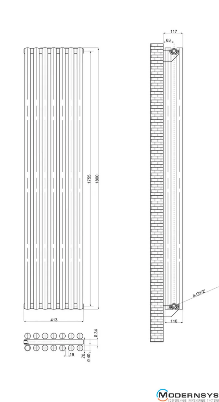 Технические характеристики: Вертикальный дизайнерский радиатор ARTTIDESIGN (Арттидизайн) Matera II 7/1800/413/50 серый матовый