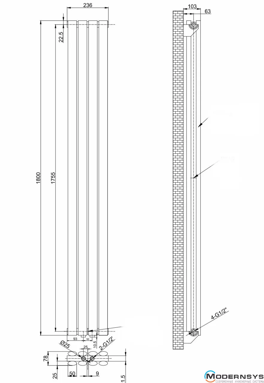 Технические характеристики: Вертикальный дизайнерский радиатор ARTTIDESIGN (Арттидизайн) Rimini II 4/1800/236/50 серый матовый