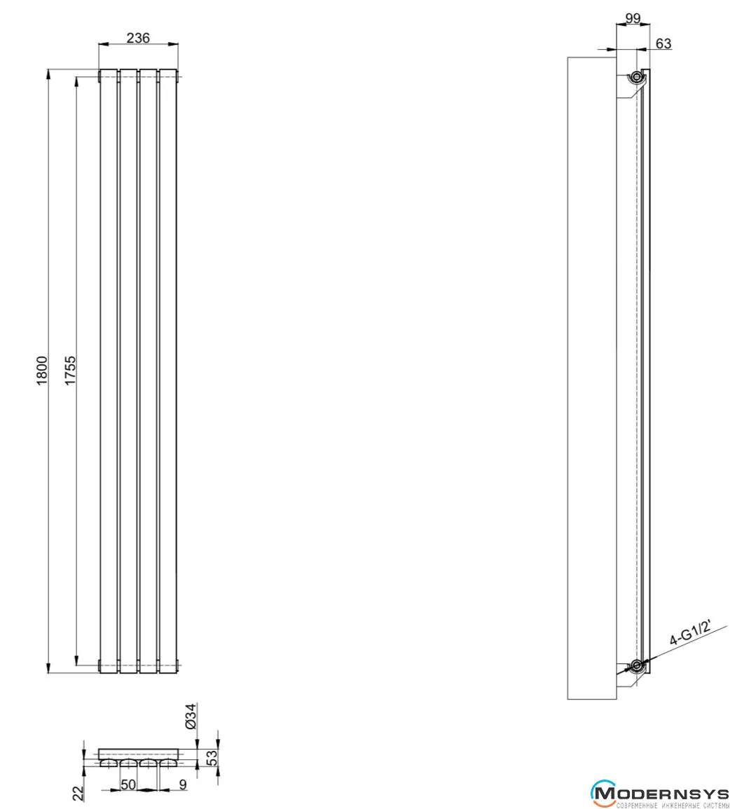 Технические характеристики: Вертикальный дизайнерский радиатор ARTTIDESIGN (Арттидизайн) Terni 4/1800/236 серый матовый