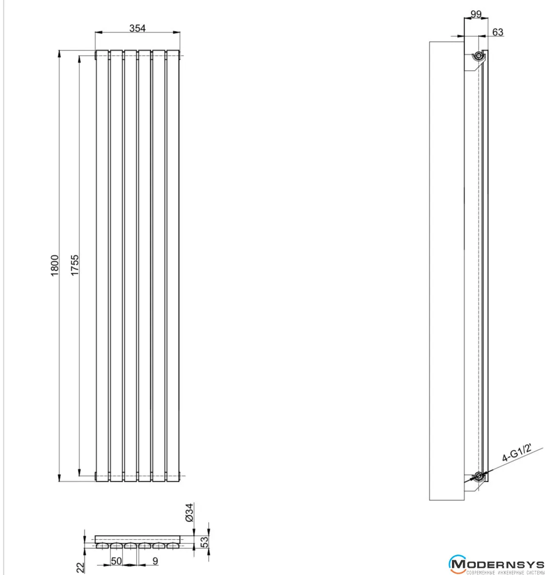 Технические характеристики: Вертикальный дизайнерский радиатор ARTTIDESIGN (Арттидизайн) Terni 6/1800/354 черный матовый