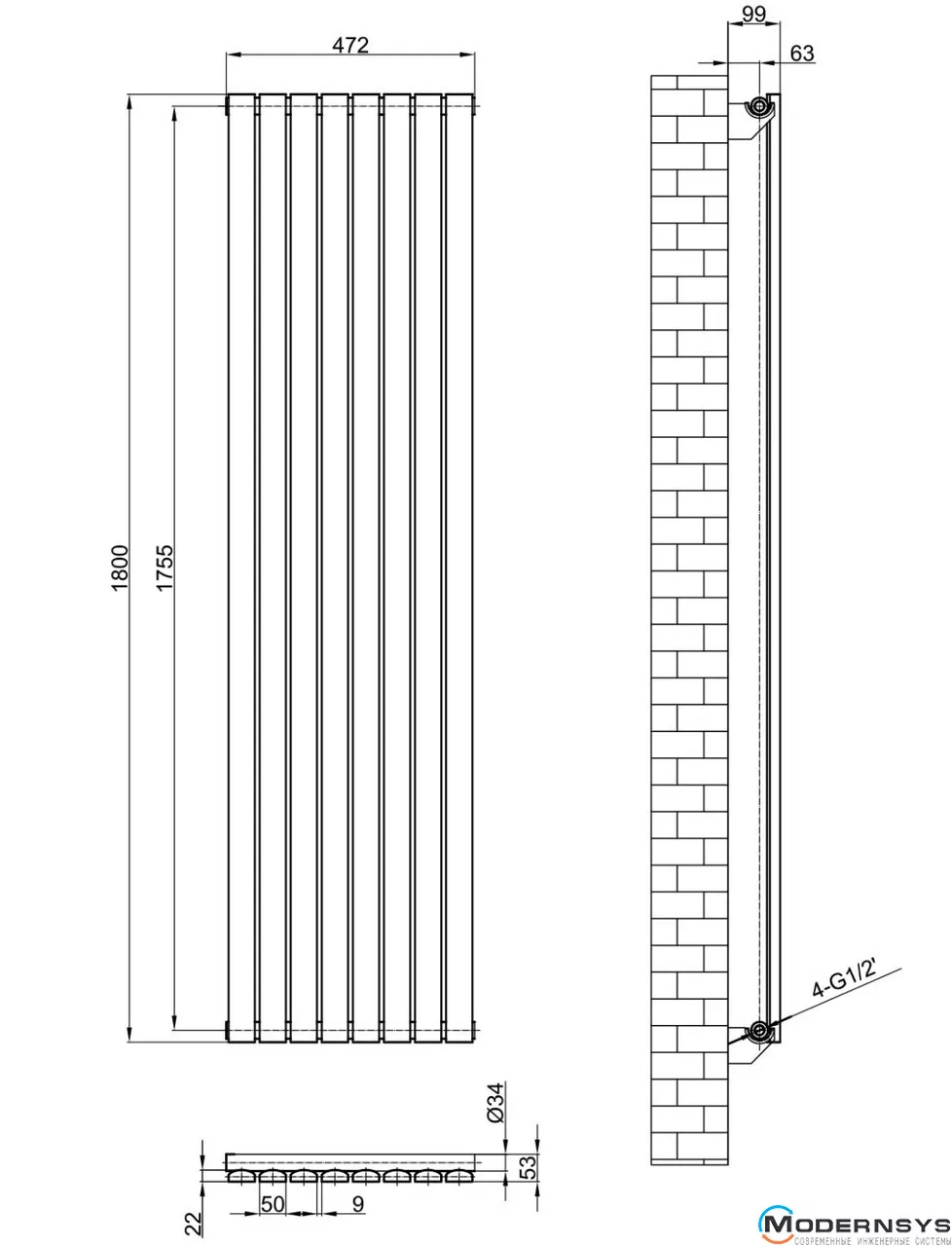 Технические характеристики: Вертикальный дизайнерский радиатор ARTTIDESIGN (Арттидизайн) Terni 8/1800/472 черный матовый