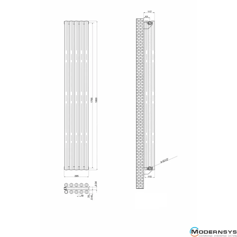Технические характеристики: Вертикальный дизайнерский радиатор отопления ARTTIDESIGN (Арттидизайн) Matera II 5/1800/295/50 серый матовый