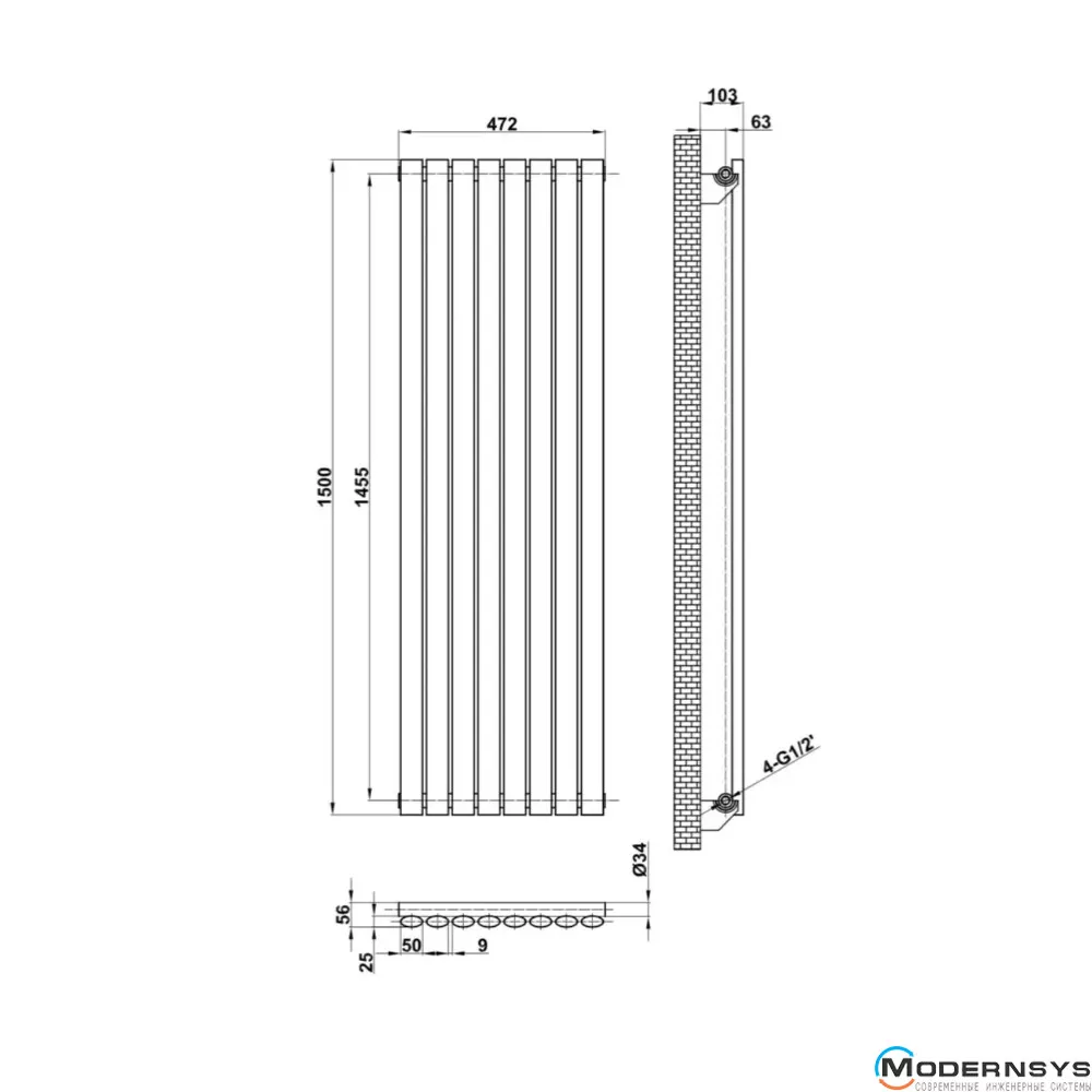 Технические характеристики: Вертикальный дизайнерский радиатор отопления ARTTIDESIGN (Арттидизайн) Rimini 8/1500/472/50 белый матовый
