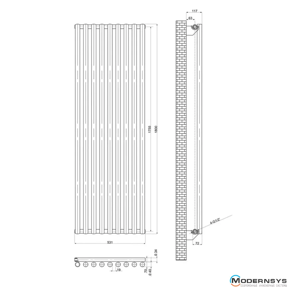 Технические характеристики: Вертикальный радиатор отопления ARTTIDESIGN (Арттидизайн) Matera 9/1800/531/50 белый матовый