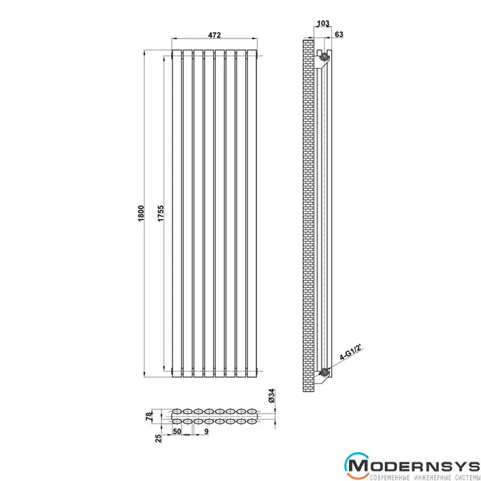 Технические характеристики: Вертикальный радиатор отопления ARTTIDESIGN (Арттидизайн) Rimini II 8/1800/472/50 белый матовый