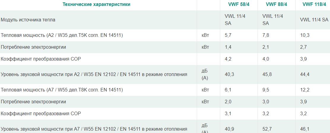 Технические характеристики для серии воздушных модулей Vaillant aroCOLLECT VWL SA